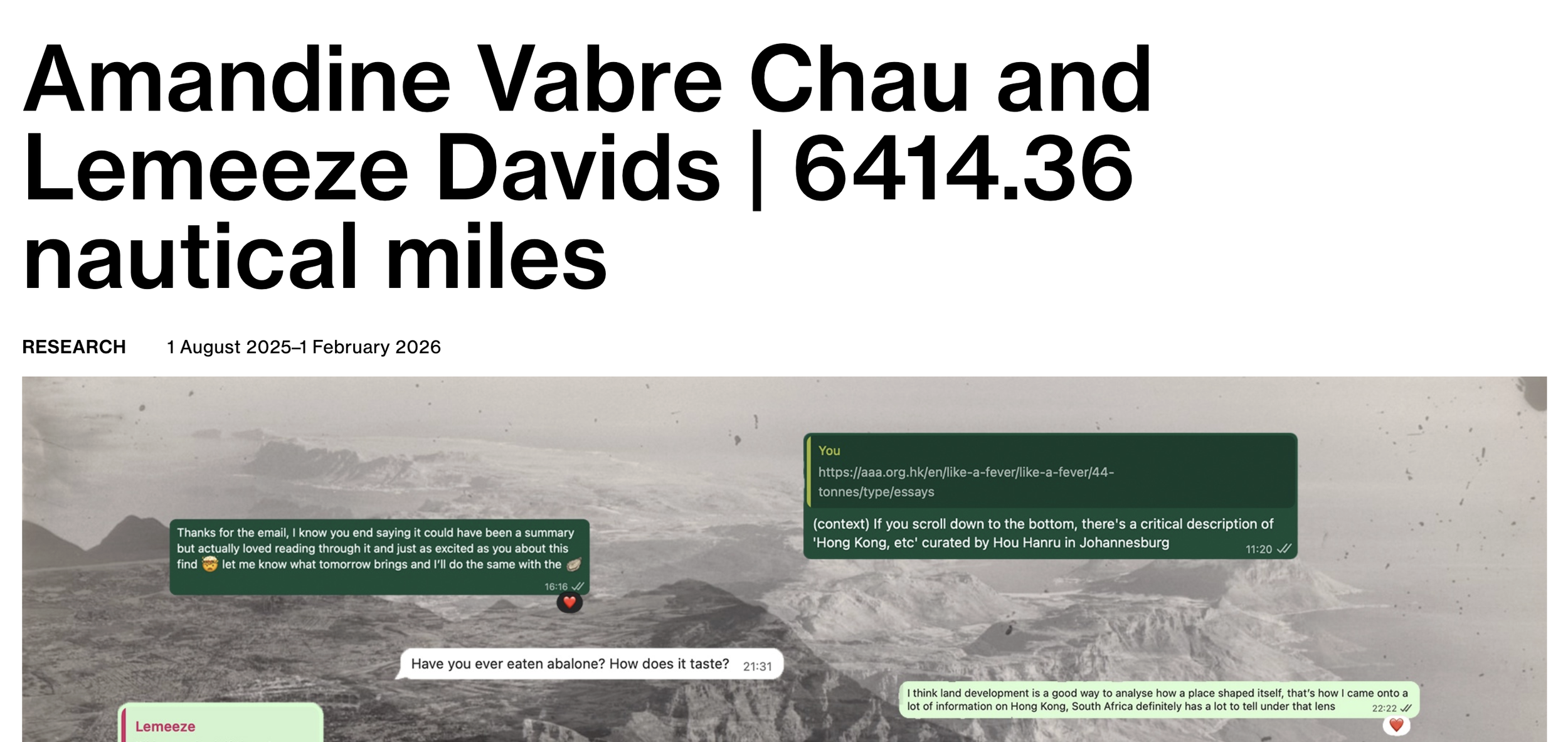 As Lemeeze Davids (Cape Town) and Amandine Vabre Chau (Hong Kong) work together, their research dialogue turns towards form. 6414.36 nautical miles becomes an articulation of a curatorial process, understanding how ideas take shape across time zones, and how research can be held in correspondence. The expression remains deliberately indeterminate, attending to the unfolding of questions as much as to their possible futures. Gradually extending into forms of writing, shared discussion and presentation, each iteration adds to an ongoing process of curatorial exchange.
