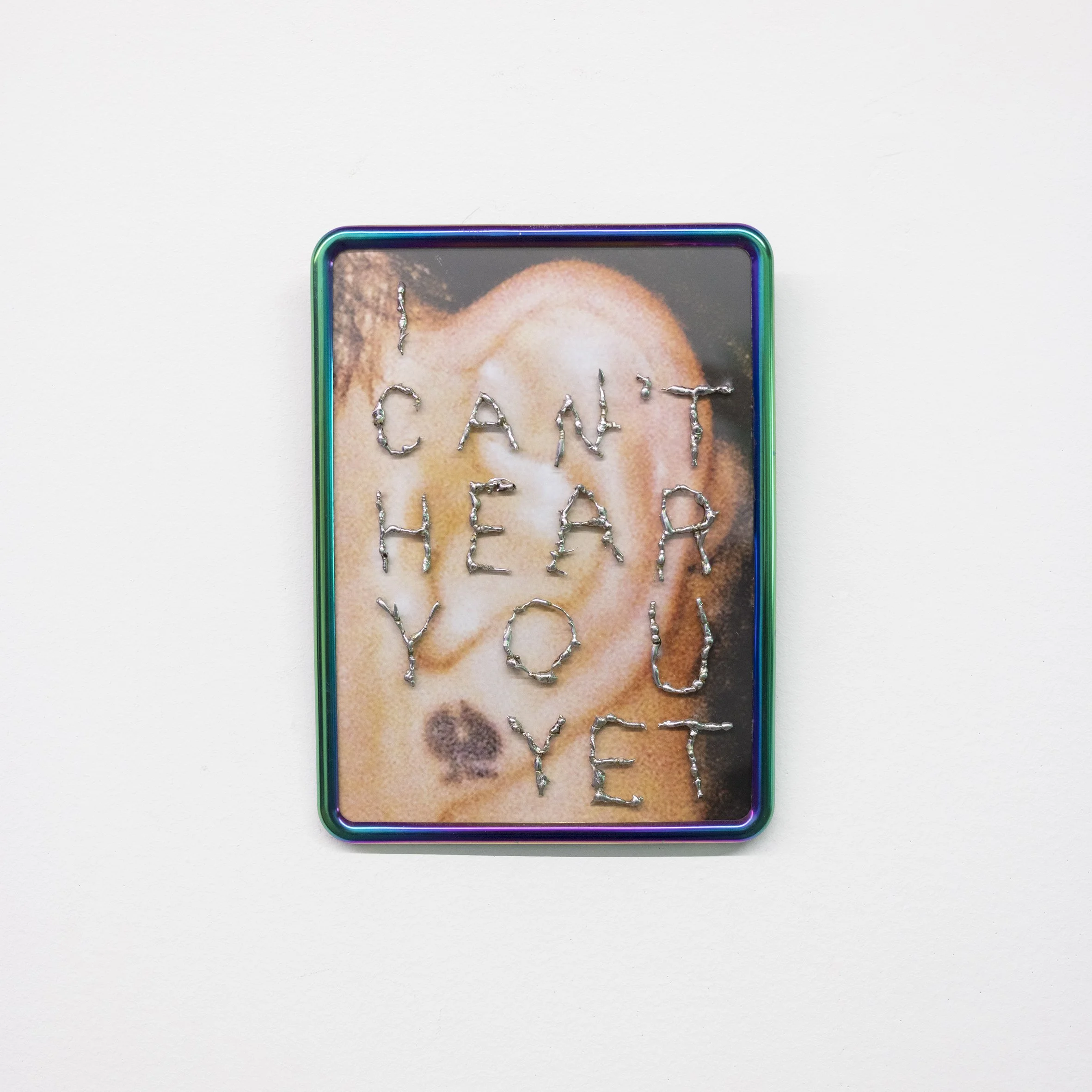 Prune Phi - I can’t hear you yet, 2022. Plaque d’immatriculation de scooter, photographie, étain.